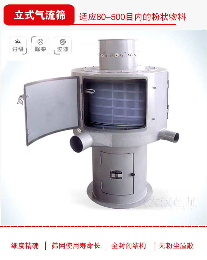 氣流篩:80-530目的各種粉狀物料篩選分級,適用于橡膠粉,脫水蔬菜粉,食鹽,化肥,玻璃粉,硫磺粉,鉛粉,石英粉,銅粉,鋁粉等物料中。